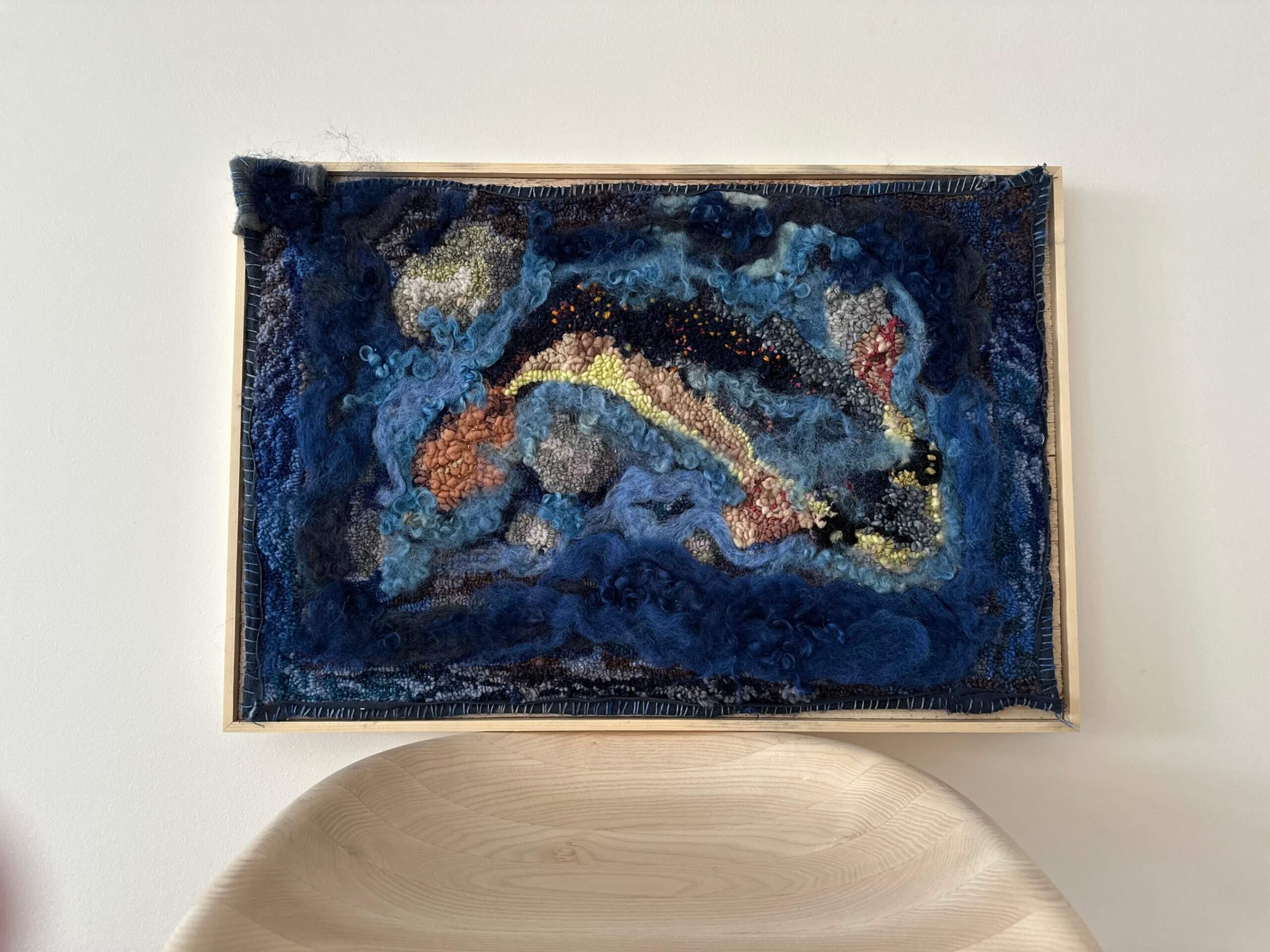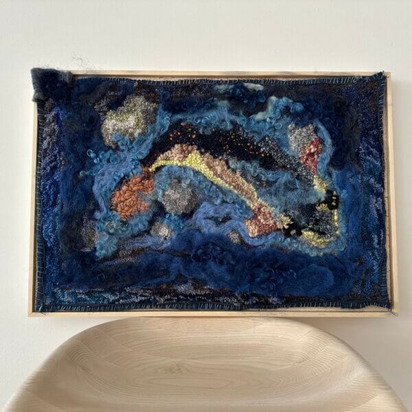Alissa Ehrenkranz blends her naturalistic wildlife drawing practice with elements of abstract and modernist painting methods to bring the color, texture, and movement of wildlife into focus. She employs textiles to convey a tactile sense of the atmosphere and mood of the setting, using simplified forms to capture the energy of her subjects. Starting with a Nature Journaling practice, Alissa records the details of the mountainscapes around her, including science notations of weather and geological conditions, capturing the local Steppe Prairie native plants and animals, including Sagebrush, Chokecherry, Elk, Deer, Red-Tailed Hawks, and Trout, among others. Alissa begins with a series of drawings and watercolors to reduce her subjects into form, color, and movement. She then outlines the results onto linen or burlap and proceeds to ink, watercolor, and stitch (hook, embroider, crochet, collage, felt, etc.) the final composition. Her materials are derived from local wool producers, recycled silks and cottons, and botanically dyed unspun wool roving. Alissa lives and works in Jackson Hole, Wyoming.