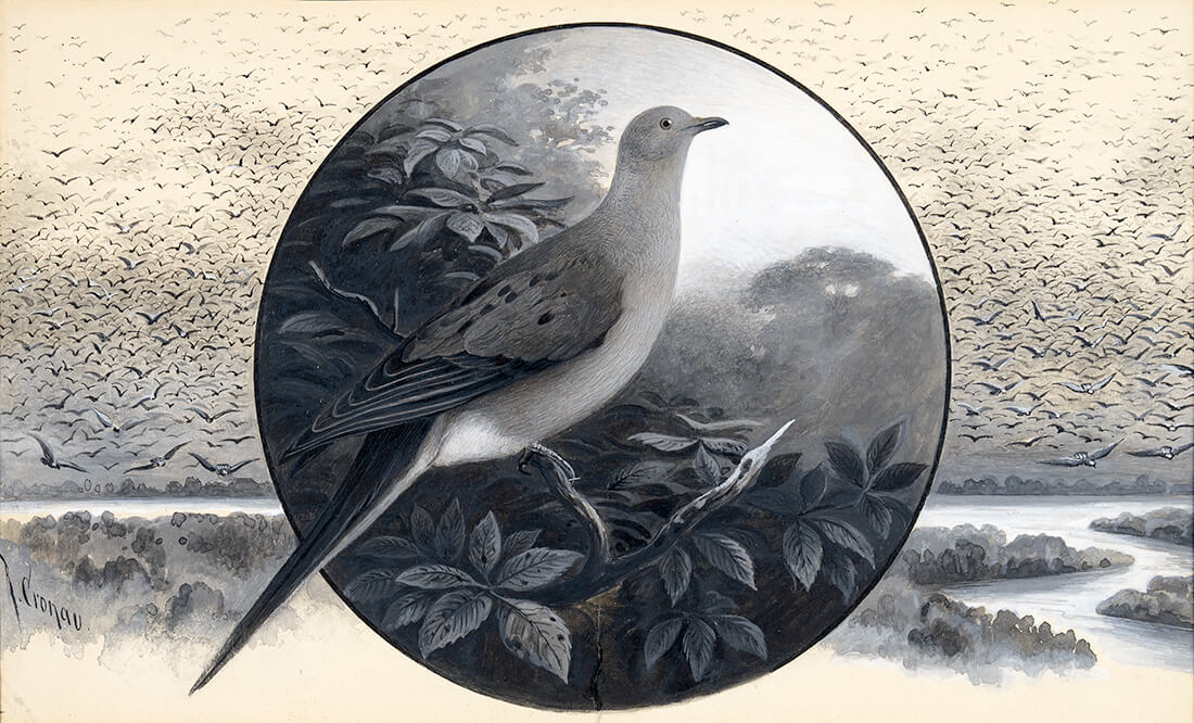 - Rudolf Cronau (Germany, 1855 – 1939), Last Passenger Pigeon, 1899. Watercolor, gouache, and graphite on paper. 7 ¾ × 12 ¾ inches. Gift of Alfred F. King, National Museum of Wildlife Art.
