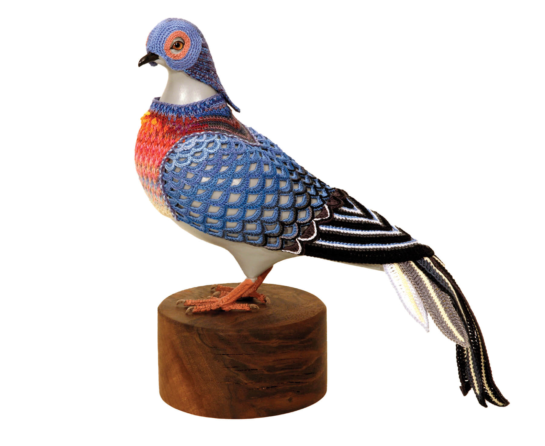 - Laurel Roth Hope (United States, born 1973), Biodiversity Reclamation Suits for Urban Pigeons: Passenger Pigeon II, 2014. Yarn, polyurethane, pewter, glass, epoxy, and walnut stand. 12 × 5 ½ × 12 inches. Courtesy Crystal Bridges Museum of American Art, Bentonville, Arkansas. © Laurel Roth Hope.