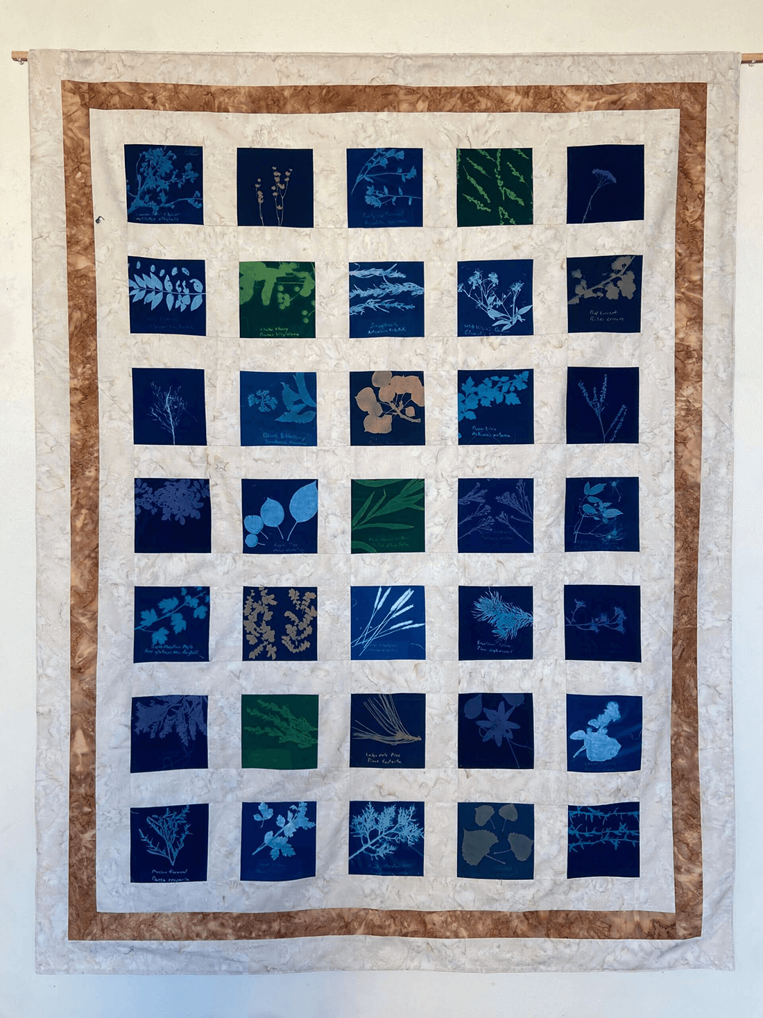 - © Bailey Russel and Kiana Henny, The Plants of Wyoming, after Anna Atkins, 2024. Photograms on cyanotype coated cloth, stitched. 68 x 51 inches.