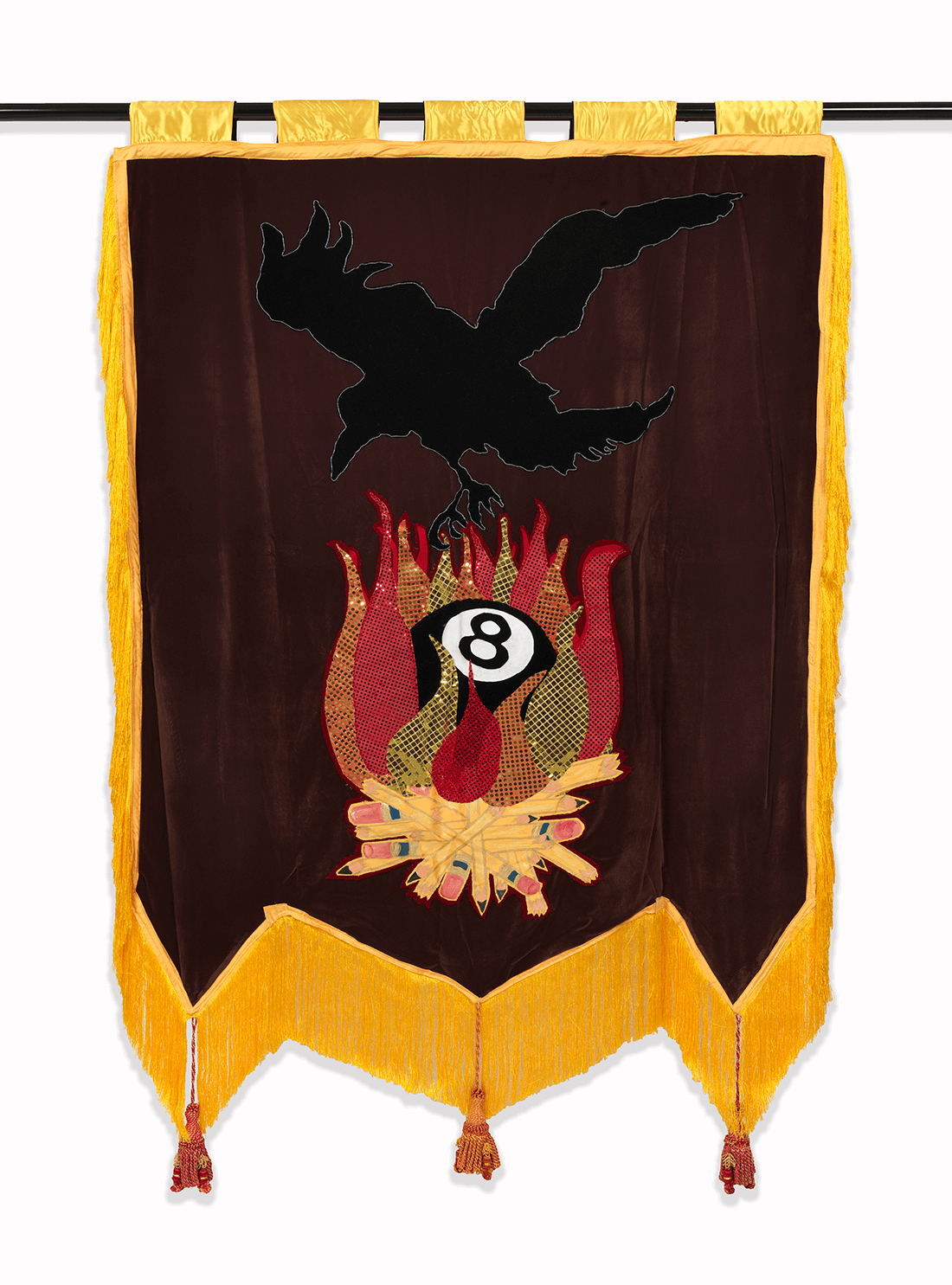 - © Cauleen Smith, Leave Me For the Crows, 2017. Satin, poly-satin, silk-rayon velvet, indigo-dyed silk-rayon velvet, indigo-dyed silk satin, acrylic fabric paint, poly-silk tassel, sequins, and metal rod. 78 x 51 ½ inches. Courtesy of the artist and Morán Morán.