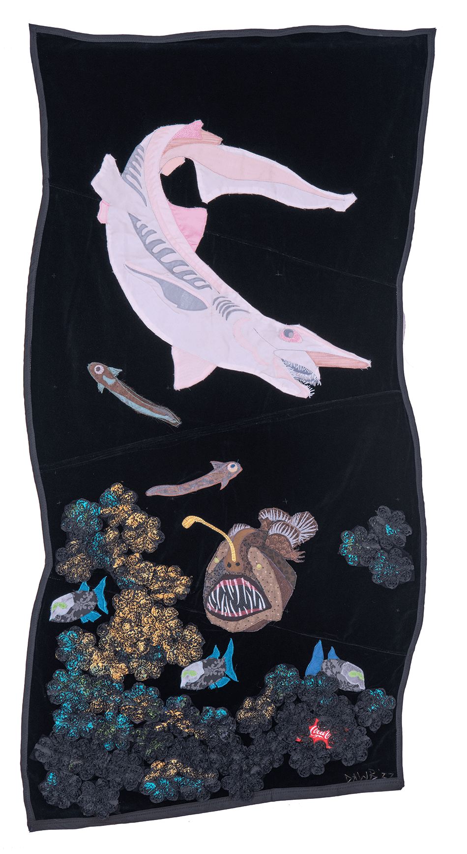 - © Dawn Williams Boyd, 35,812 Feet Below Sea Level: Challenger Deep, 2022. Assorted fabrics, cotton embroidery floss, and mixed media. 59 x 30 inches. Courtesy of the artist and Fort Gansevoort, New York.