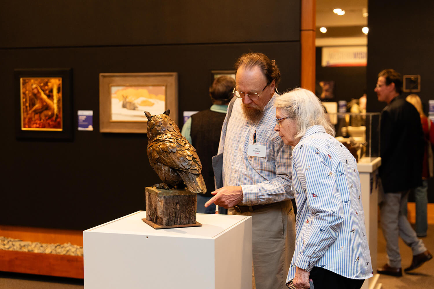 October 12, 2023The exhibition for the 36th Annual Western Visions Art Show + Sale opened on September 9, with over 170 pieces on display. In-person tickets for the Show + Sale night on September 14 sold out prior to the event, with a combined total of nearly 400 people participating in person and online. Nearly 80 artists were also in attendance, one of the highlights of the event. “Western Visions has always been a unique opportunity for visitors and collectors to meet contemporary wildlife artists. Not only do they have the chance to see their work inside the Museum, but they also form valuable connections and relationships,” says Museum Director Steve Seamons. The artwork sold benefited both the Museum and participating artists, and awards were given. This was the second year that the event included a live auction component. Artwork sales continued through the close of the exhibition on October 1, 2023, and totaled over half a million dollars for the event, with 116 pieces selling. Western Visions is the National Museum of Wildlife Art’s largest and longest-running fundraiser and is one of the signature events of the Jackson Hole Fall Arts Festival.