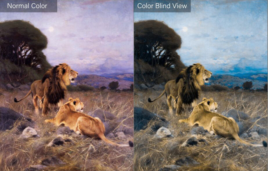 - Wilhelm Kuhnert (Germany, 1865 – 1926), African Lions, c. 1911. Oil on canvas. 64 x 50 inches. Gift of The Robert S. and Grayce B. Kerr Foundation, National Museum of Wildlife Art. Color Blind Conversion Courtesy of EnChroma.