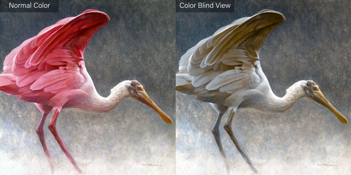 - Robert Bateman (Canada, b. 1930), Roseate Spoonbill, 2002. Acrylic on board. 24 x 24 inches. National Museum of Wildlife Art Collection. © Robert Bateman. Color Blind Conversion Courtesy of EnChroma.