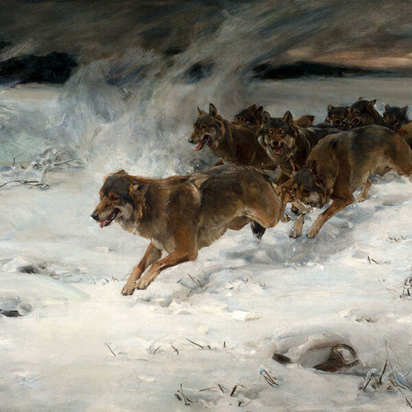 - Alfred Wierusz Kowalski (Poland, 1849 – 1915), A Pack of Wolves, n.d.. Oil on canvas. 36 1/2 x 48 5/8 inches. On Loan from William G. Kerr, National Museum of Wildlife Art.