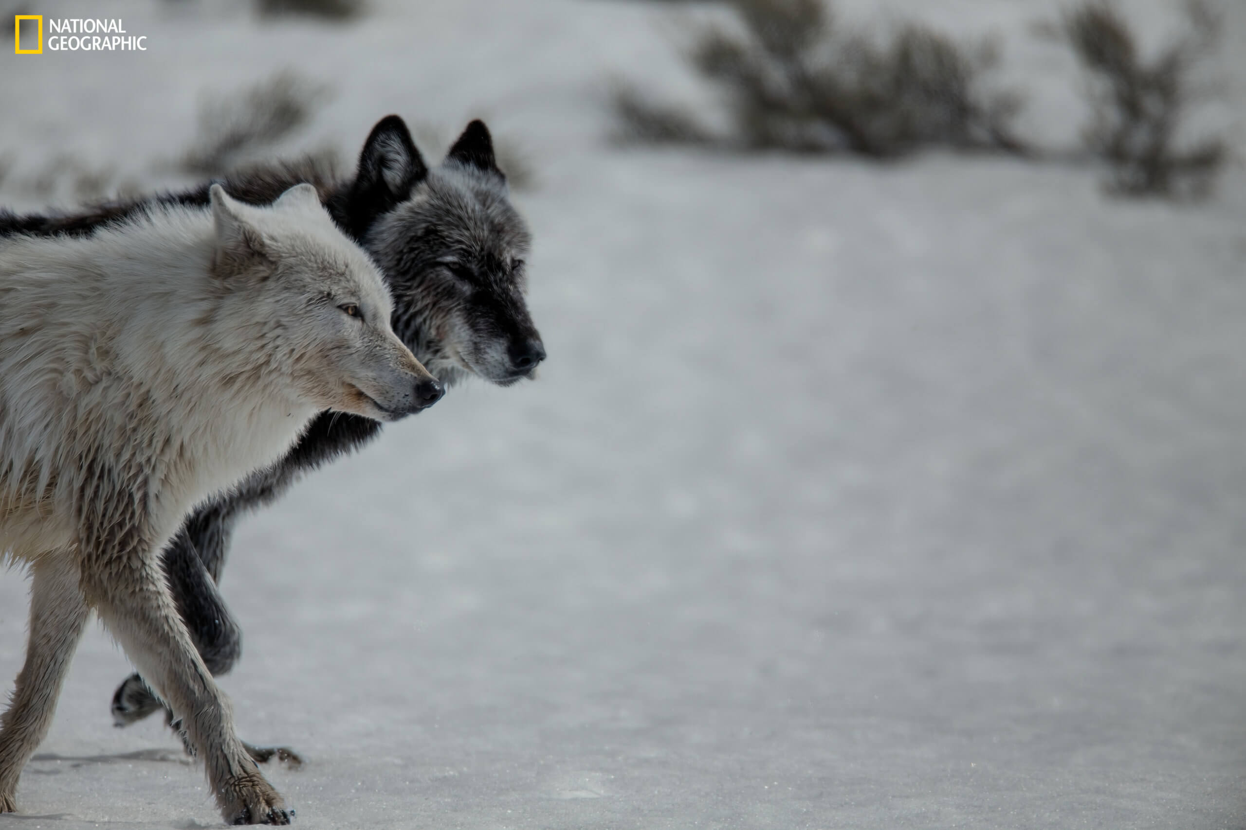 - Two wolves, one with a white coat and one with a black coat, travel through the Hayden Valley of Yellowstone National Park. Though wolves in Yellowstone vary in coat color, they are all members of the species Canis lupus (gray wolf). These two were a bonded pair, leading Yellowstone’s Canyon pack together for nine years. The female was later illegally shot inside the park.