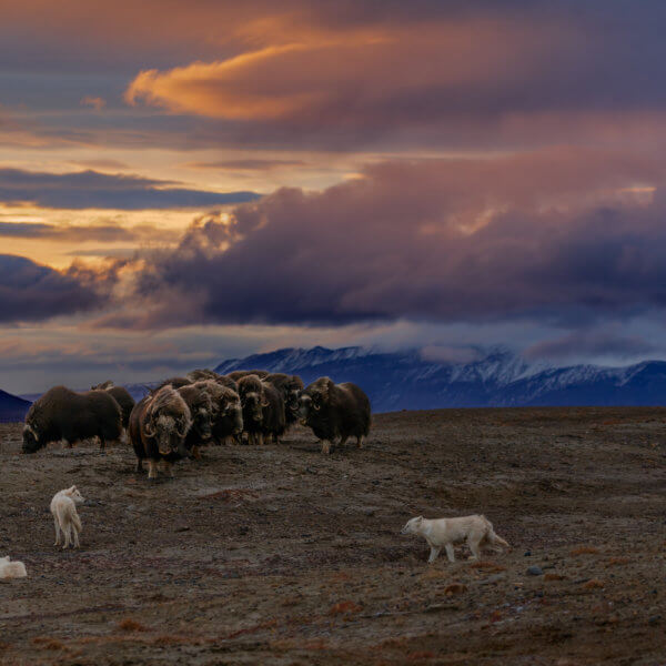 - Hunts in the Arctic often last for hours. This photo shows a standoff between wolves and muskoxen which ended after six hours; the muskoxen held higher ground and successfully defended themselves until the wolves gave up.