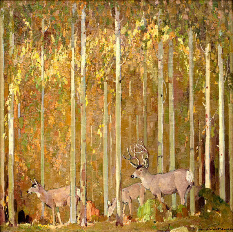 William Herbert Dunton (American, 1878 – 1936), Black Tail Deer in Aspens, 1925. Oil on canvas. 14 x 14 inches. JKM Collection®, National Museum of Wildlife Art.